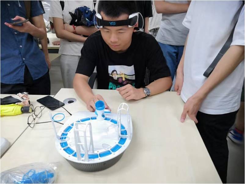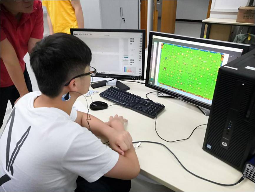 为了让团组成员对科研项目有更直观的了解科研项目,电机与计算机工程学院的万峰老师带领同学们去实验室参观了三项具体的实验,第一项是专注度训练项目,即用不同的专注度控制不同频段的风力以驱动小球越过障碍;第二项是令被实验者控制脑电波alpha波的大小在阈值之下以控制昆虫的移动;第三项是通过观察两个不同频率的频闪方格在脑中产生同频率的波,通过仪器获取这些波后用算法实现控制小车前后移动的功能。