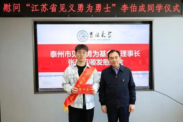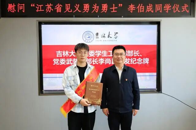 2023级本科生李伯成同学。江苏省见义勇为基金会理事长弘强、吉林省委政法委一级巡视员李光辉、海角社区